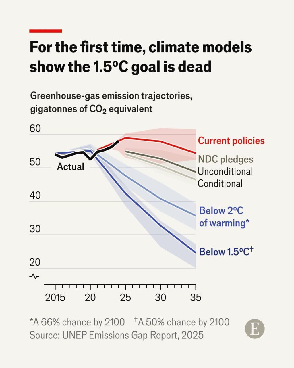 The Economist – hardly a revolutionary rag – has delivered a blunt verdict on the Paris Agreement: the 1.5 degree goal is dead. Attempts by governments to limit global warming to 1.5 degrees above pre-industrial levels, have failed, and even the theoretical routes to limiting the relentless rise of global temperatures are now ruled out.