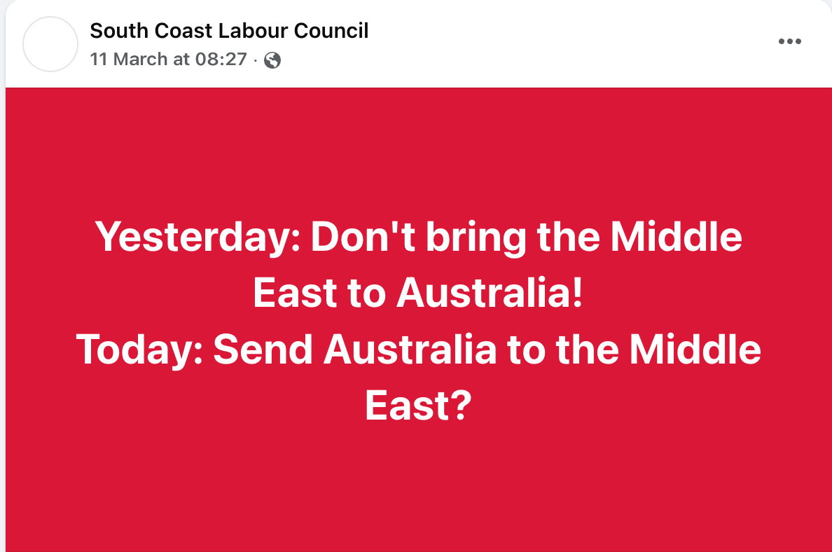 The South Coast Labor Council has rightly parodied the government’s logic. The political establishment has spent months attacking anti-genocide protesters for ‘bringing the Middle East to Australia’. Yet it is perfectly acceptable for Australia to send troops to the Middle East, it seems.