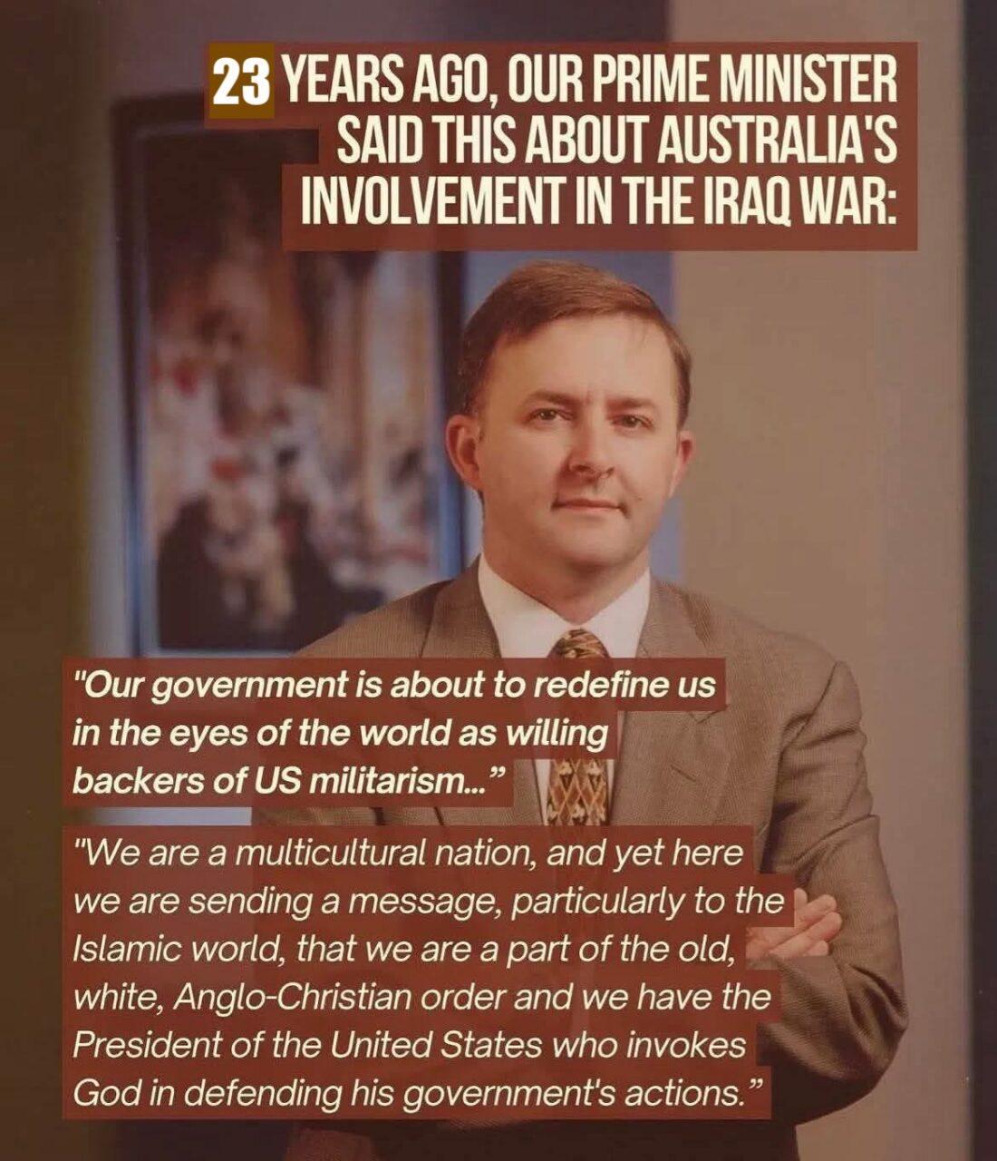 Albanese once understood the dangers of following Washington into war. On 20 March 2003, condemning Australia’s participation in the invasion of Iraq, Anthony Albanese told parliament: “Our government is about to redefine us in the eyes of the world as willing backers of US militarism.”