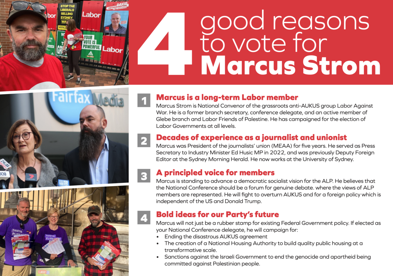 Notes of a candidate: Marcus Strom stood to represent Sydney ALP at National Conference on a staunchly anti-AUKUS and pro-Palestine platform, winning nearly 30% of the vote. After a complaint from a supporter of his opponent, Linda Scott, the returning officer suspended him from campaigning.