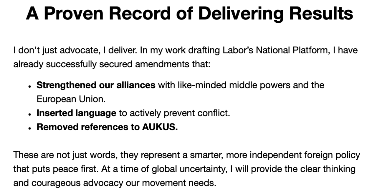 This was reflected in the final emails from Linda Scott just before ballots closing, where she shifted her language and claimed that she had made a real difference by “removing references to AUKUS” in the draft ALP National Platform through her role on the National Policy Forum.