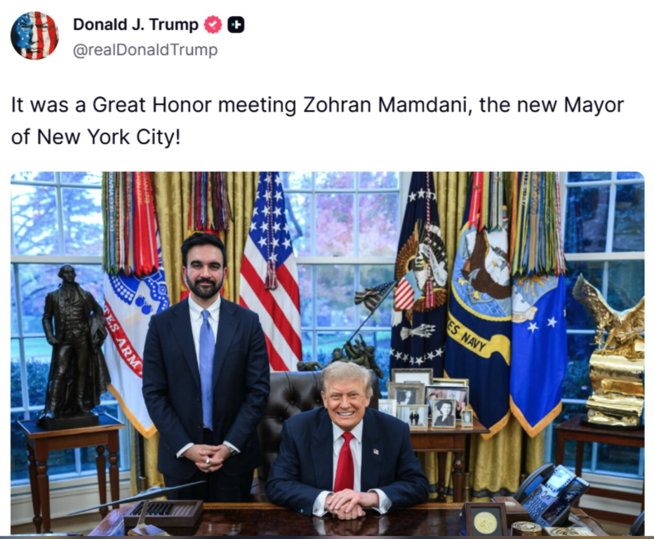 This past week Mamdani met with Trump in the White House, the meeting was billed as a discussion between the two men about how they can best serve the interests of NYC. For the past few days, the strange sight of a visibly uncomfortable Mamdani side by side with a seemingly smitten Trump flashing him a beaming smile has been circulating. Many commentators are suggesting that Mamdani had gotten the best of Trump, winning him over with his boyish charm and shared love of NYC.